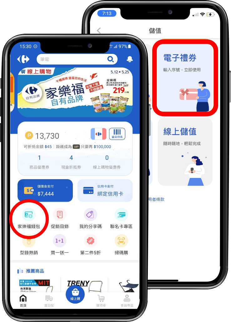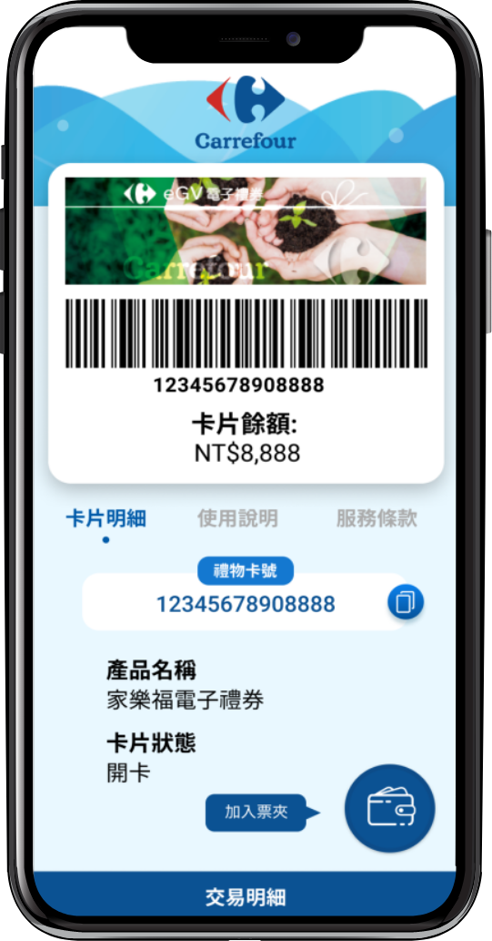開啟錢包儲值功能,輸入電子禮券卡號儲值,即可至家樂福全台門市使用,錢包支付再享紅利點數2倍送,優惠多更多。