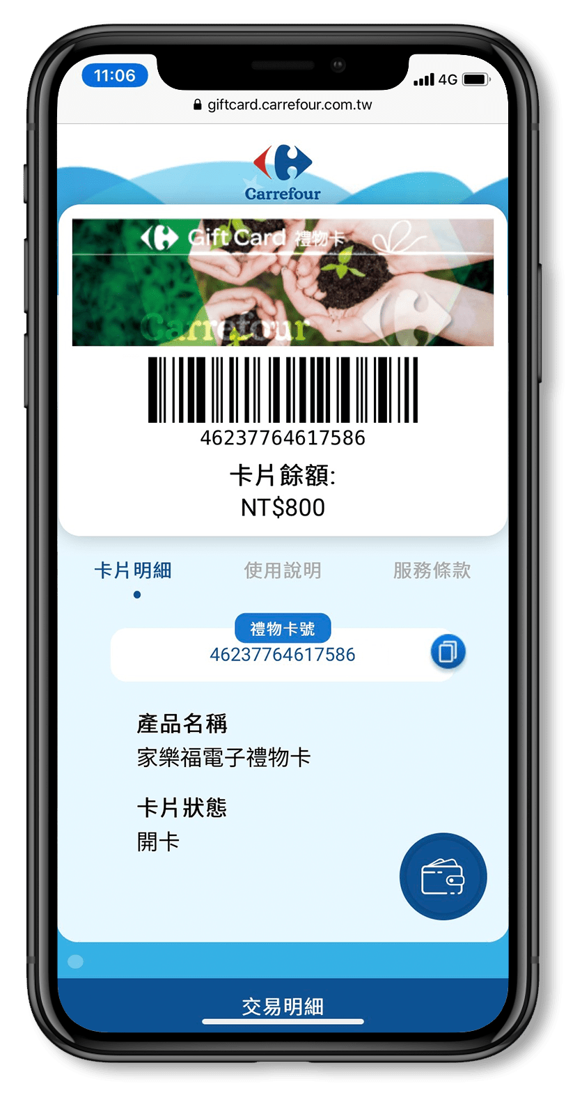 4.電子禮物卡餘額不得直接兌換為現金,但可儲值於家樂福錢包於家樂福賣場兌換商品。