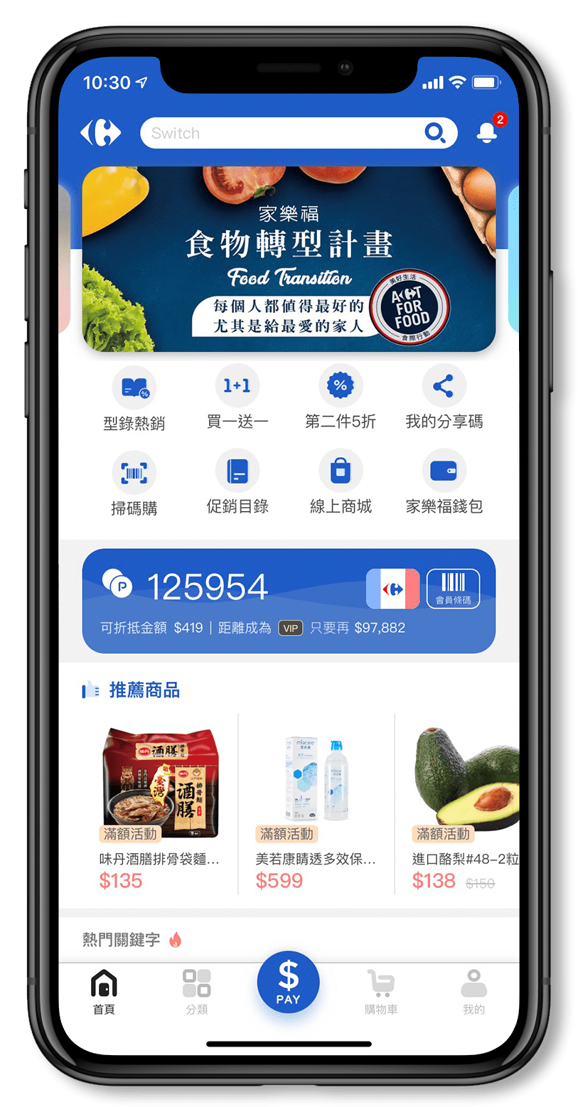 透過簡訊/Email發送票券給使用者。點開簡訊/Email上的連結,即可開啟電子票券,憑電子禮券上的條碼,即可直接至家樂福所有門市消費使用。