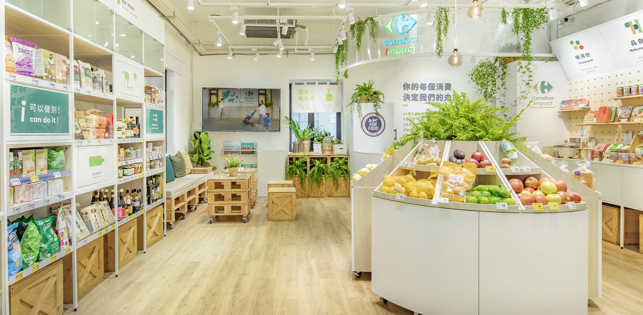 在生鮮商品挑選,特別以多樣裸賣商品為主,更多了許多不用農藥、化學肥料的有機蔬果,以及家樂福嚴選生鮮CQL,希望對於能為環境更盡一份心力,現場許多無添加、少添加的麵包,全部使用健康的安佳奶油,讓消費者吃得更健康,不僅如此,還有許多非籠飼機蛋的商品,同時更有許多有故事、有理念的地方特色商品、社企商品、公平貿易的商品也是特別的亮點。